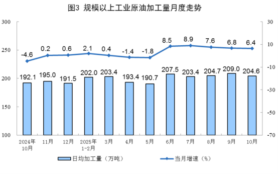 原油加工平穩(wěn)增長(zhǎng)。10月份,規(guī)上工業(yè)原油加工量6343萬(wàn)噸,同比增長(zhǎng)6.4%;日均加工204.6萬(wàn)噸。1—10月份,規(guī)上工業(yè)原油加工量61424萬(wàn)噸,同比增長(zhǎng)4.0%。