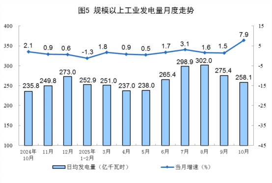 規(guī)上工業(yè)電力生產(chǎn)增速加快。10月份,規(guī)上工業(yè)發(fā)電量8002億千瓦時(shí),同比增長(zhǎng)7.9%,增速比9月份加快6.4個(gè)百分點(diǎn);日均發(fā)電258.1億千瓦時(shí)。1—10月份,規(guī)上工業(yè)發(fā)電量80625億千瓦時(shí),同比增長(zhǎng)2.3%。